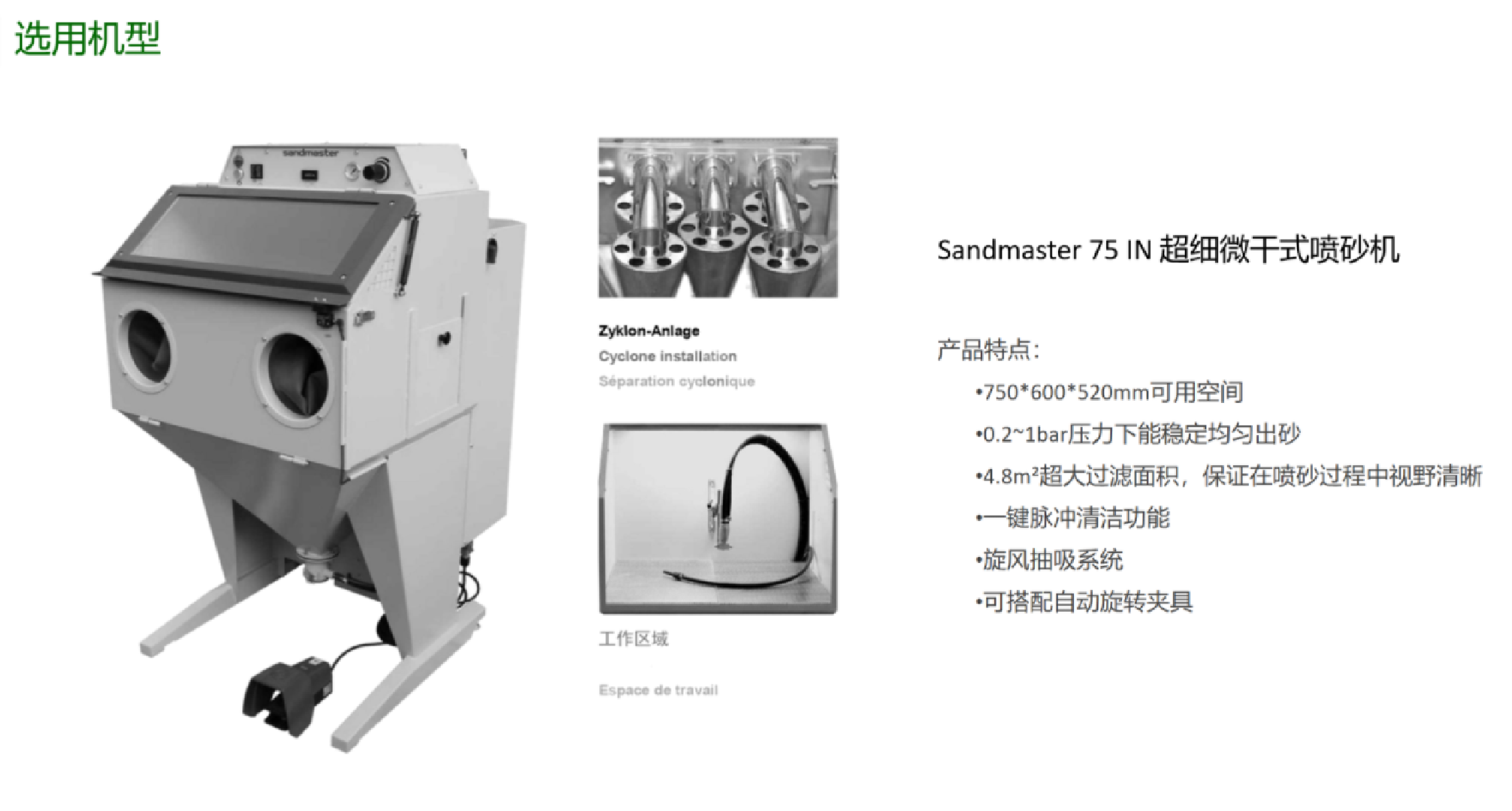 产品特点: 900*1300*1650(长*宽*高) 36个上料工位 公转加自转平台实现 360° 喷砂 过滤面积 1m² 喷枪 5mm